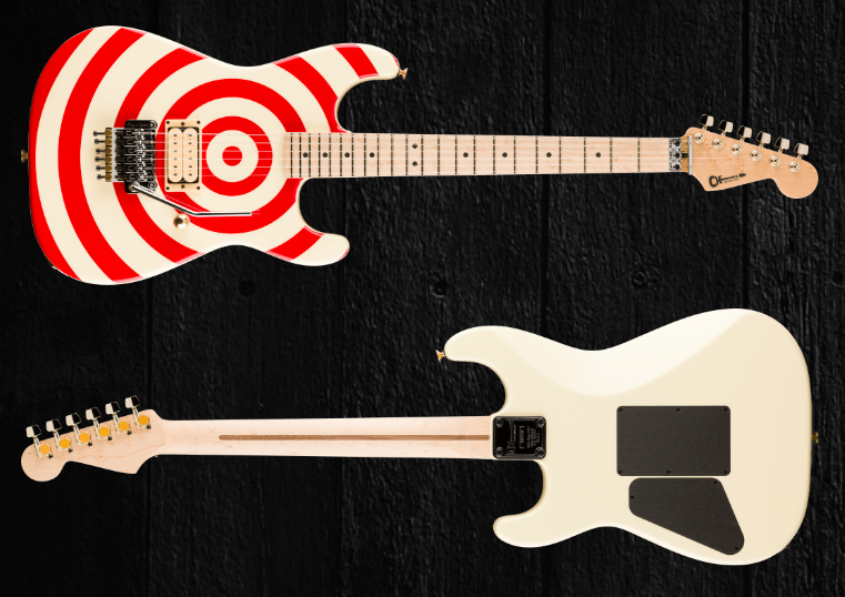 Custom Bullseye Artwork; High-Gloss Urethane Finish; Premium Alder Body Wood; Oil Finished Birdseye Maple Bolt-On Neck Construction; Single-Piece Neck; Strat® Style Headstock; Heavy-Rolled Shoulders; Black 1/4" Dot Fingerboard Inlays; 22 - Jumbo Frets; Black Side Dots; Floyd Rose® Locking Nut; Chrome 1984 Floyd Rose® Top-Mount Bridge; Single Humbucker Pickup Rout; DiMarzio® Super Distortion® Crème Bobbins Bridge Pickup; Legacy Brass Tuning Keys; Brass Knurled Metal Dome Knob(s); Brass 17mm Strap Buttons; .009" to .042" Strings; 3+3 Style Black Logo; Molded Hardshell Case; Certificate of Authenticity.