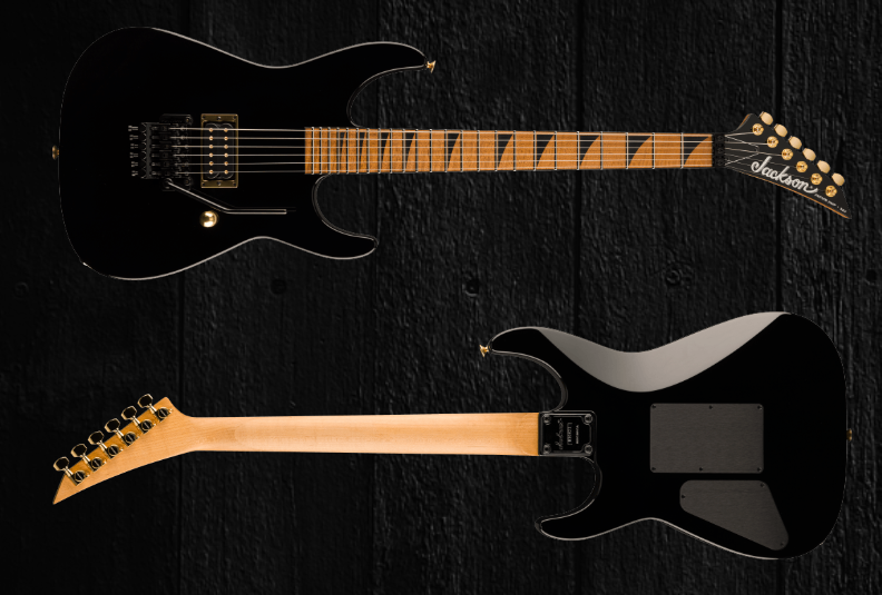 High-Gloss Polyester Finish; Roasted Alder Body Wood; Oil Finished Caramelized Quartersawn Maple Bolt-On Neck Construction; Caramelized Flame Maple Fingerboard; Jackson® Headstock; Black Binding; Black Sharkfin Fingerboard Inlays; 24 - Stainless-Steel Jumbo Frets; Brass Side Dots; Floyd Rose® Locking Nut; Black Floyd Rose® Top-Mount Bridge; Single Humbucker Pickup Rout; DiMarzio® Super Distortion® Black Bobbins Bridge Pickup; Gold Gotoh® Tuning Keys; Brass Knurled Metal Dome Knob(s); Brass 17mm Strap Buttons; .009" to .042" Strings; 80's Style White Logo; Molded Hardshell Case; Certificate of Authenticity.
