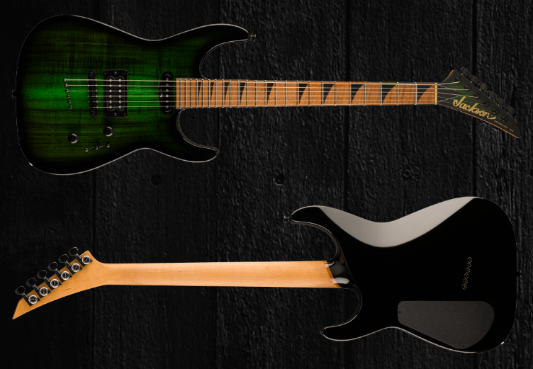 High-Gloss Urethane Finish; Roasted Alder Body Wood; Tasmanian Blackwood Top; Oil Finished Caramelized Quartersawn Maple Neck-Thru Design; Caramelized Flame Maple Fingerboard; Jackson® Headstock; Black Binding; Black Sharkfin Fingerboard Inlays; 24 - Jumbo Frets; Brass Side Dots; Brass Nut; Black Tune-O-Matic Bridge; Hum - Single Pickup Rout; DiMarzio® Super Distortion® Black Bobbins Bridge Pickup; Fender® Hand-Wound Texas Special Strat® Black Bobbins Neck Pickup; Black Gotoh® Locking Tuning Keys; Black Knurled Metal Dome Knob(s); 3-Way Blade Switch; Black 17mm Strap Buttons; .009" to .042" Strings; 90's Style Gold Logo; Molded Hardshell Case; Certificate of Authenticity.