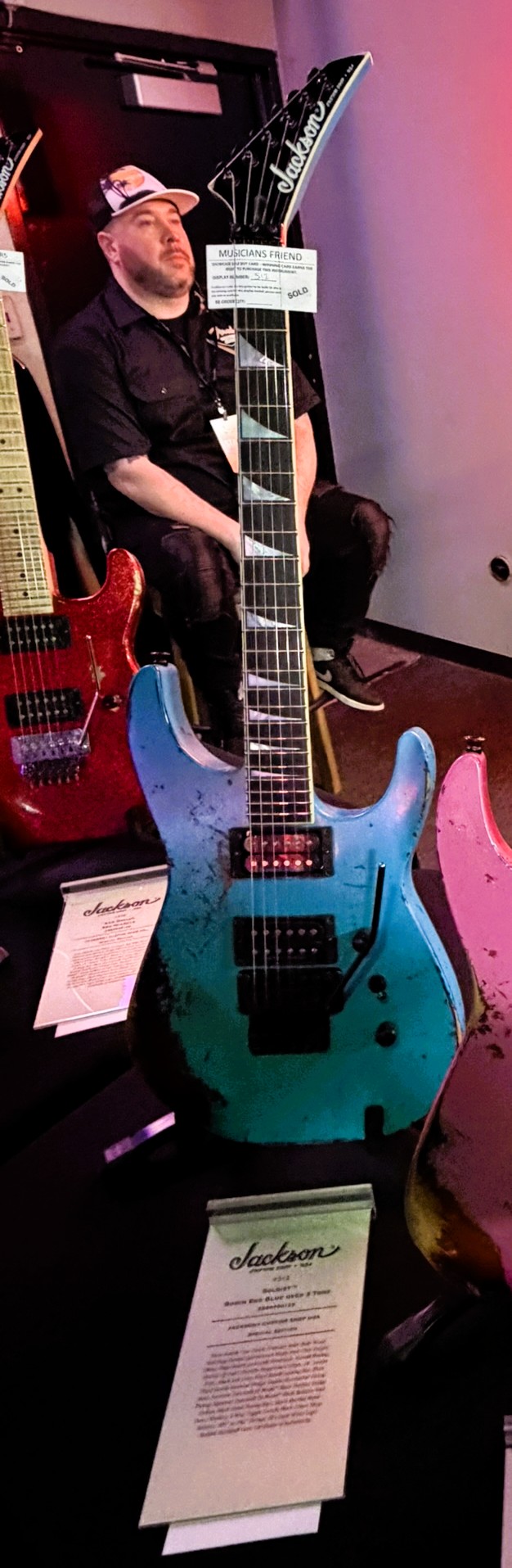 Nitro-Relic® Tour Finish; Premium Alder Body Wood; Matching Painted Quartersawn Maple Neck-Thru Design; Ebony Fingerboard; Jackson® Headstock; Ivoroid Binding; Mother-Of-Pearl Sharkfin Fingerboard Inlays; 24 - Jumbo Frets; Black Side Dots; Floyd Rose® Locking Nut; Black Floyd Rose® Recessed Bridge; Double Humbucker Pickup