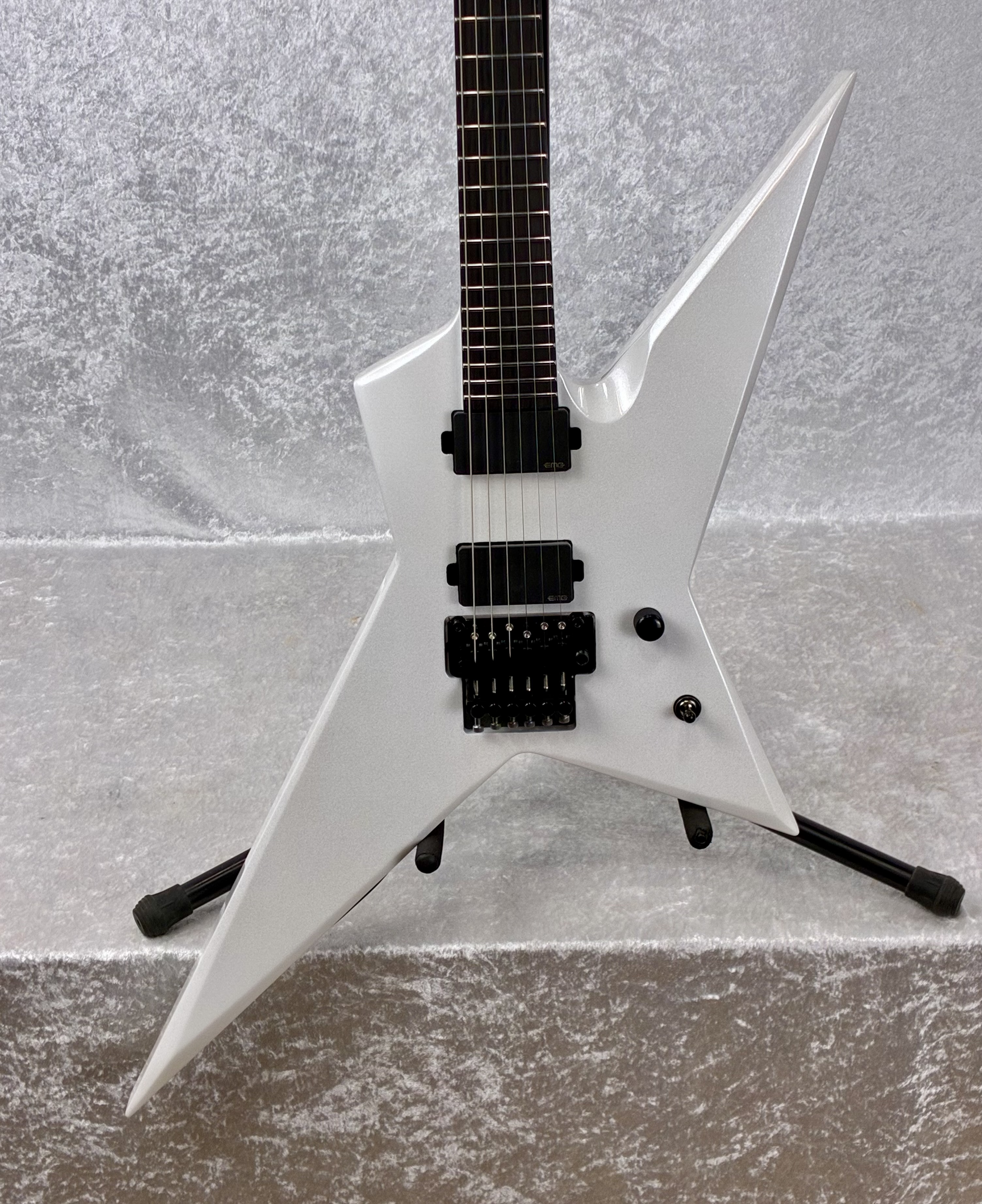 The LTD Deluxe RS-1000 offers ESP’s immediately-noticeable Random Star shape in a guitar designed for professional players who require the versatile tones, smooth playability, and complete reliability for serious recording and touring needs. Finished in gleaming Pearl White. the RS-1000 is packed with everything you need for your most exhilarating performances. That includes neck-thru-body construction at 24.75” scale, with mahogany body wings paired to an extra-thin U-shaped three-piece maple neck that offers a Macassar ebony fingerboard, 24 extra-jumbo stainless steel frets, and a reverse headstock with matching finish. Components on this metal machine include a Floyd Rose 1000SE double-locking tremolo with stainless steel screws, precise Grover tuners, and a set of super-aggressive direct-mount EMG 81 (bridge) and EMG 85 (neck) active pickups.