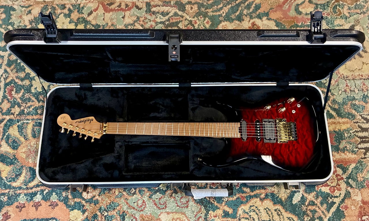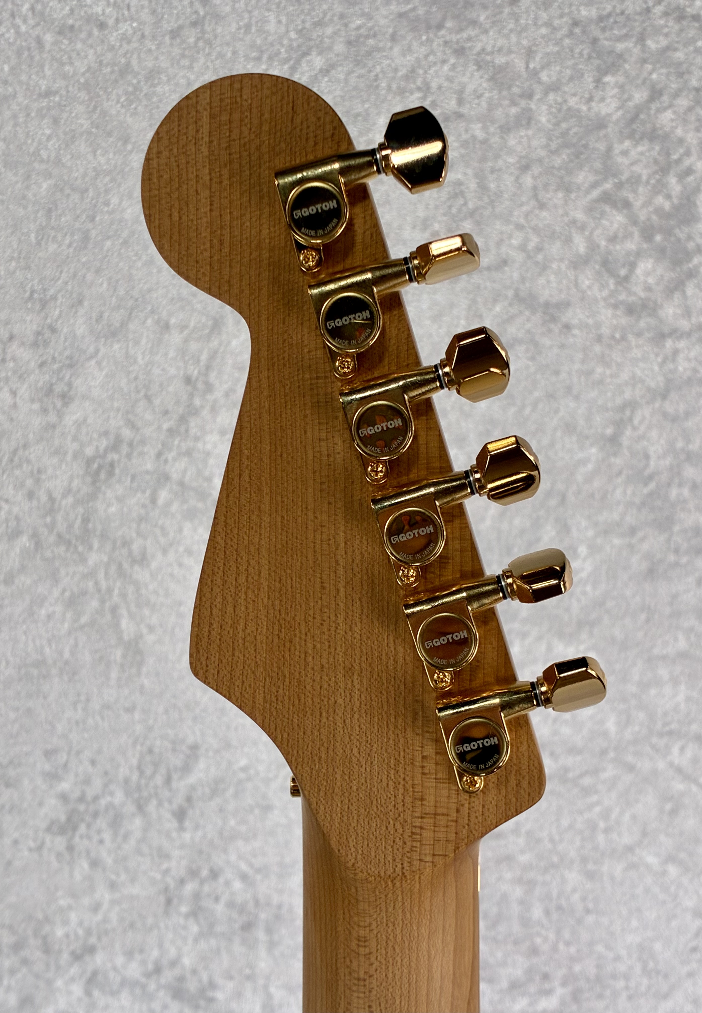 High-Gloss Polyester Finish; Roasted Ash Body Wood; Figured Quilt Maple Top; Oil Finished Caramelized Quartersawn Maple Bolt-On Neck Construction; Caramelized Flame Maple Fingerboard; Strat® Style Headstock; Heavy-Rolled Shoulders; No Fingerboard Inlays; 24 - Jumbo Frets; Luminlay® Blue Side Dots; Floyd Rose® Locking Nut;
