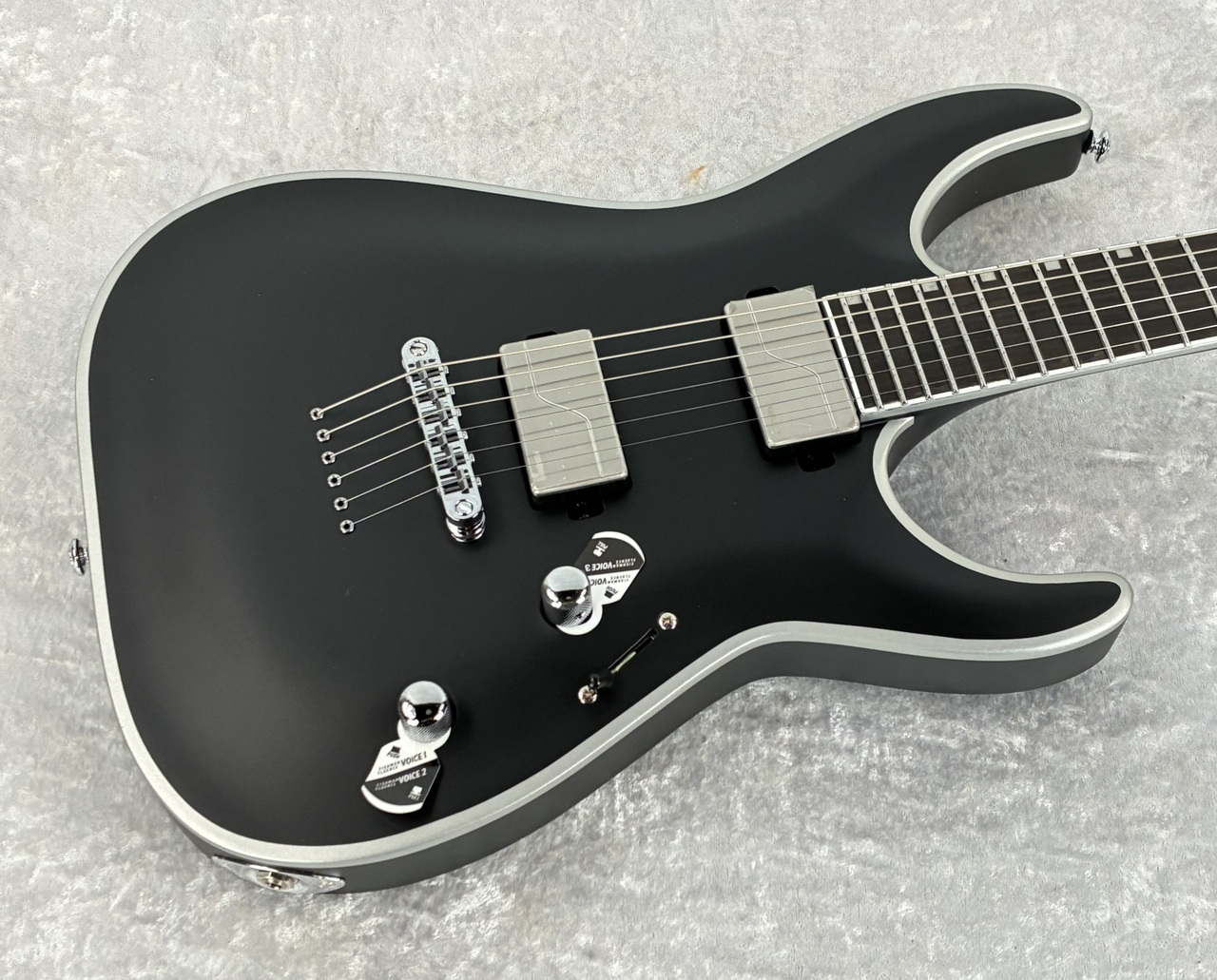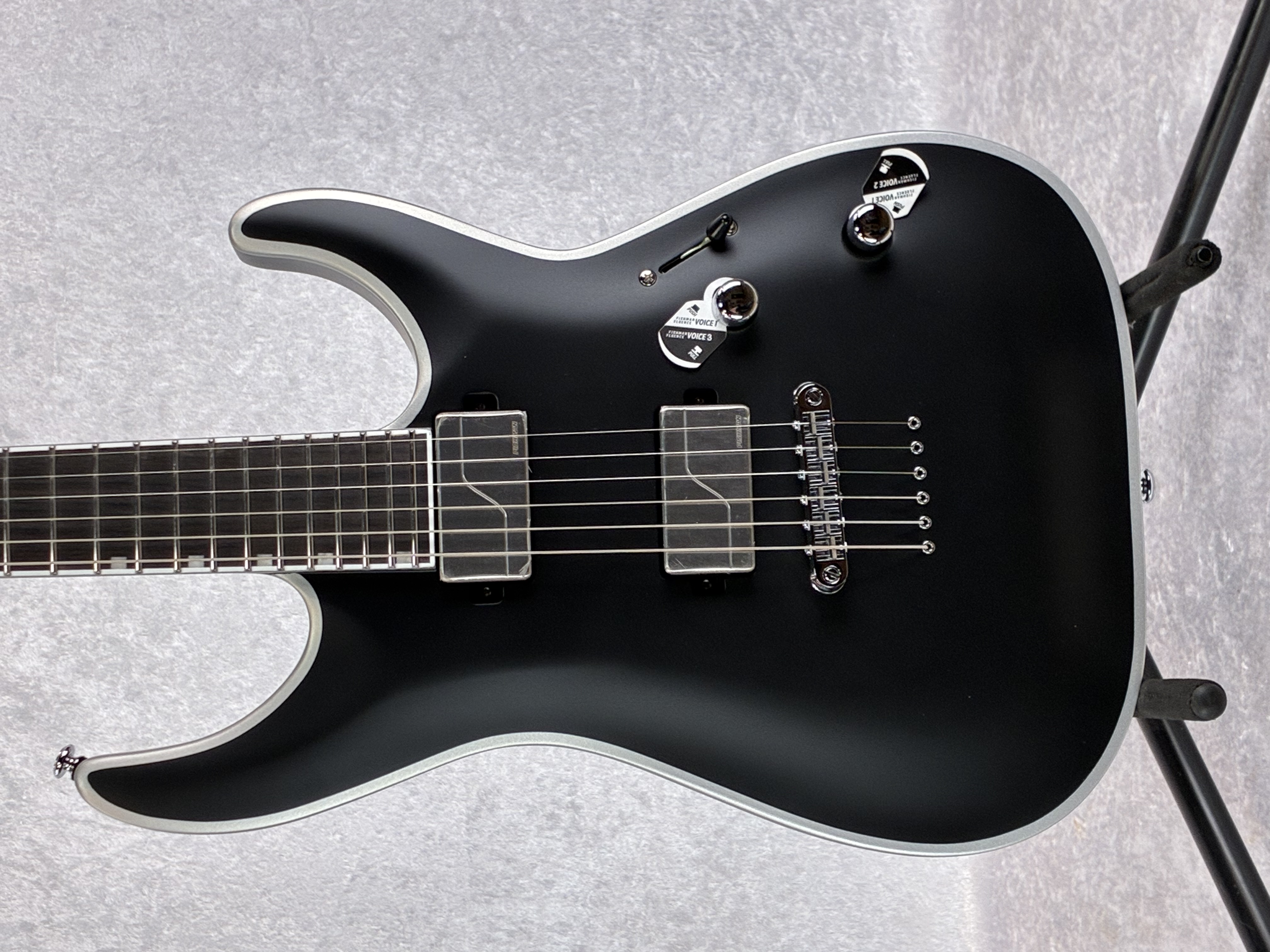 The LTD Deluxe MH-1000NT Bold Binding in Black Satin finish features double-thick silver painted binding on the body and headstock, set-thru construction at 25.5” scale, a mahogany body with maple cap, and a three-piece maple neck. Its Macassar ebony fingerboard has a compound radius, offset block inlays, and 24 extra-jumbo stainless steel frets. Components include chrome hardware, a TonePros locking bridge with string-thru-body, LTD locking tuners, and a pair of Fishman Fluence Modern 3-Voice Humbucker pickups with voice selection on a push-pull controls. Set-Thru 25.5" Mahogany w/ Maple Cap - 3Pc Maple Macassar Ebony 300-400mm Compound BLACK SATIN / BOLD BINDING 42mm Molded Extra Thin U MOP Block 24 XJ Stainless Steel Chrome Standard LTD Locking TonePros Locking TOM w/ String Thru Fishman Alnico Modern Hum 3-Voice Brushed Stainless *(Pull Vol Voice 3/Tone Voice 2) - Fishman Ceramic Modern Hum 3-Voice Brushed Stainless *(Pull Vol Voice 3/Tone Voice 2) Active Vol/Tone(Push/Pull)/3-way Switch D'Addario XL120 (.009/.011/.016/.024/.032/.042) MH FORM FIT CASE / NOT INCLUDED