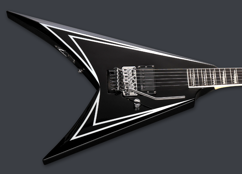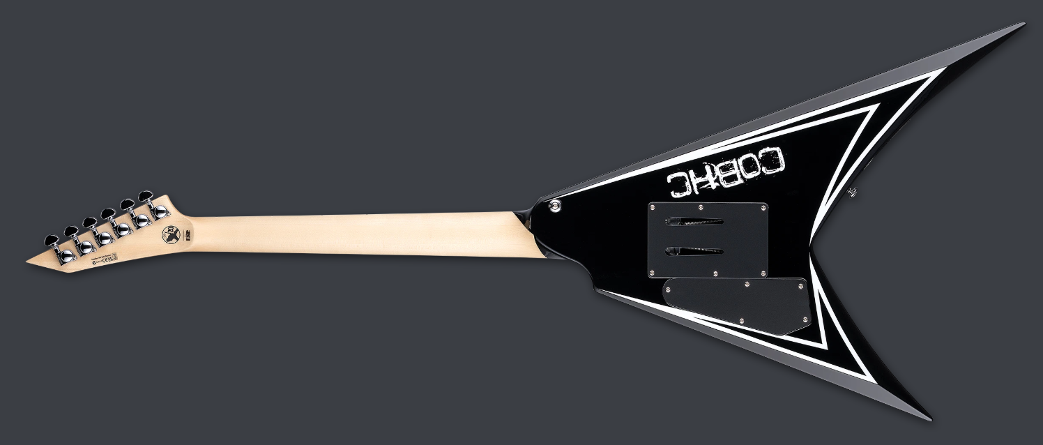 Twenty years ago in 2006, ESP Guitars produced the first two Signature Series guitars for Alexi Laiho, the frontman and lead guitarist in Finnish melodic death metal masters Children of Bodom. As a masterful musician and songwriter, Alexi influenced an entire generation of guitar players with his combination of mind-blowing neoclassical lead lines and pure blazing speed. To commemorate this milestone anniversary of Alexi’s relationship with ESP, we’re proud to introduce the Special Edition Signature Series Alexi Laiho Sawtooth SE 20th Anniversary. Based on Alexi’s familiar offset V shape, this guitar is an homage to one of the first Alexi signature models offered by ESP, with brilliant white pinstripes that align against its beveled black-finished body. Built with neck-thru-body construction at 25.5” scale, the Sawtooth SE pairs alder body wings to a thin U-shaped three-piece maple neck that features a Macassar ebony fingerboard (scalloped from frets 19-24), sawtooth-shaped pearloid inlays, and 24 extra-jumbo frets. The reverse side of the Alexi Sawtooth SE features an incredibly smooth and fast satin-finished neck, a matching white pinstripe design, and the iconic COBHC logo. Components on this outstanding guitar include chrome hardware, precise Grover tuners, a double-locking Floyd Rose 1000 bridge, and a single EMG HZ F-H2 passive pickup with volume control. Includes deluxe ESP hardshell case.