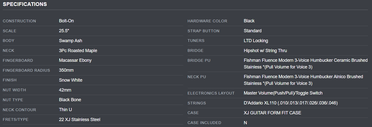 The LTD Deluxe XJ-2HT is designed for professional guitar players who require the versatile tones, smooth playability, and complete reliability for serious recording and touring needs. This guitar takes the offset, asymmetrical XJ body shape and provides it with the feature set designed for the modern musician. Built with bolt-on construction at 25.5” scale, the XJ-2HT has a resonant swamp ash body and a smooth, thin U-shaped three-piece roasted maple neck with Macassar ebony fingerboard, block pearloid inlays, 22 extra-jumbo stainless steel frets, and a matching reverse headstock. Components on the XJ-2 HT include black hardware, a black bone nut, LTD locking tuners, a Hipshot hardtail bridge with string-thru-body, and a set of direct-mounted Fishman Fluence Modern 3-Voice Humbucker pickups — ceramic in the bridge, and alnico in the neck — with brushed stainless covers. Push-pull controls allow for selection of these innovative pickups’ multiple voices.