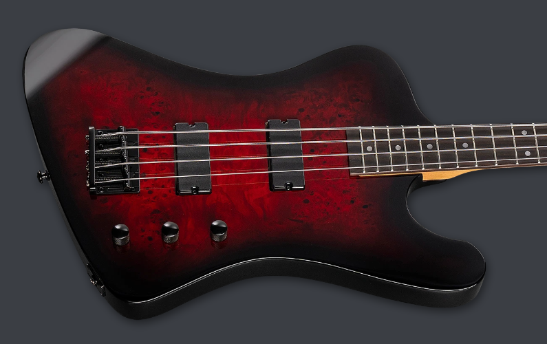 The LTD Phoenix-204DX takes the flowing curves of the Phoenix shape and delivers it in a powerful bass that’s priced to fit the budgets of most musicians. It features bolt-on construction at 34” scale, with a poplar body topped by burled poplar where the natural knots and figured grain offers a terrific aesthetic look. This bass also offers a smooth and comfortable thin U-shaped roasted maple neck and a rosewood fingerboard with dot inlays and 21 extra-jumbo frets, as well as a reverse headstock. Components on the B-204DX include black hardware, LTD vintage tuners, an LTD DB-4 fixed bridge, controls for volume, balance, and tone boost, and a set of excellent ESP SB-4 bridge and neck pickups.