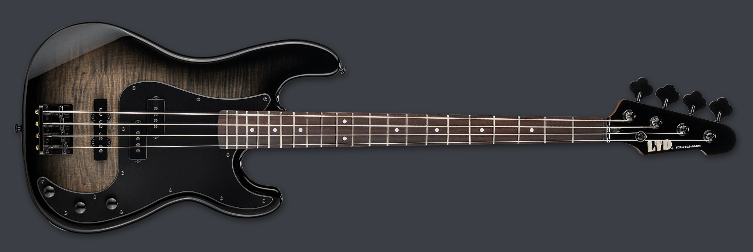 The LTD Surveyor-204DX takes a classic ESP bass shape and offers it with great LTD quality and high value. Built with bolt-on construction at 34” scale, the Surveyor-204DX includes a lightweight, resonant poplar body with a burled poplar top, imparting a superbly unique look with the knots and figured wood grain showing through the transparent finish. It features a smooth and comfortable roasted maple neck with rosewood fingerboard, dot inlays, and 21 extra-jumbo frets. Components on the Surveyor-204DX include black hardware, LTD vintage tuners, an LTD DB-4 fixed bridge, controls for volume, balance, and tone boost, and a set of ESP LJB (bridge) and LPD (neck) pickups.