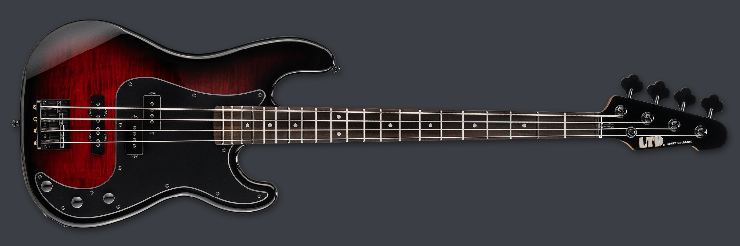 The LTD Surveyor-204DX takes a classic ESP bass shape and offers it with great LTD quality and high value. Built with bolt-on construction at 34” scale, the Surveyor-204DX includes a lightweight, resonant poplar body with a burled poplar top, imparting a superbly unique look with the knots and figured wood grain showing through the transparent finish. It features a smooth and comfortable roasted maple neck with rosewood fingerboard, dot inlays, and 21 extra-jumbo frets. Components on the Surveyor-204DX include black hardware, LTD vintage tuners, an LTD DB-4 fixed bridge, controls for volume, balance, and tone boost, and a set of ESP LJB (bridge) and LPD (neck) pickups.