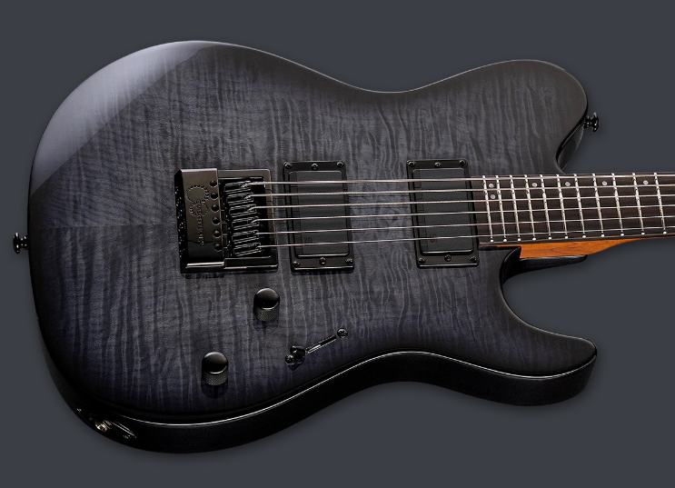 The LTD Deluxe TH-1000 EverTune FM is designed for professional guitar players who require the versatile tones, smooth playability, and complete reliability for serious recording and touring needs. The traditional shape of the guitar belies its phenomenal contemporary appointments, making it ready for any kind of performance-intensive music. It features bolt-on construction at 25.5” scale, pairing its swamp ash body — with figured flamed maple top — to a thin U-shaped three-piece roasted maple neck, with a Macassar ebony fingerboard, offset dot inlays, 24 extra-jumbo stainless steel frets, and a matching headstock. The components on this spectacular guitar include the innovative EverTune constant tension bridge, keeping your guitar in perfect tune and intonation in nearly every possible circumstance. More components of the TH-1000 EverTune FM include black hardware, a black bone nut, LTD locking tuners, a set of Seymour Duncan Mortal Coil 3-Voice Active Humbucker pickups. These outstanding ESP-exclusive pickups have push-pull controls to activate their multiple voices.