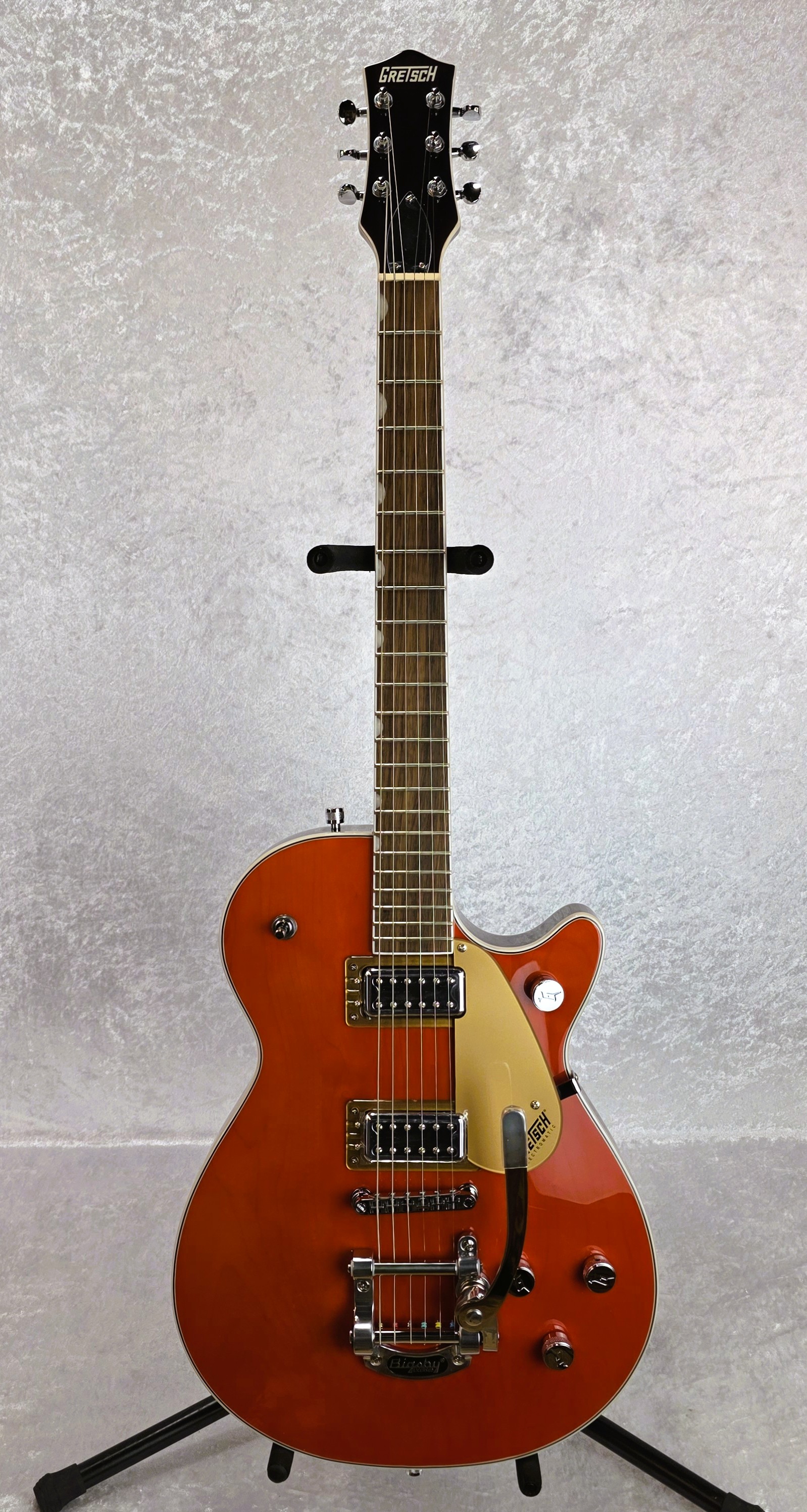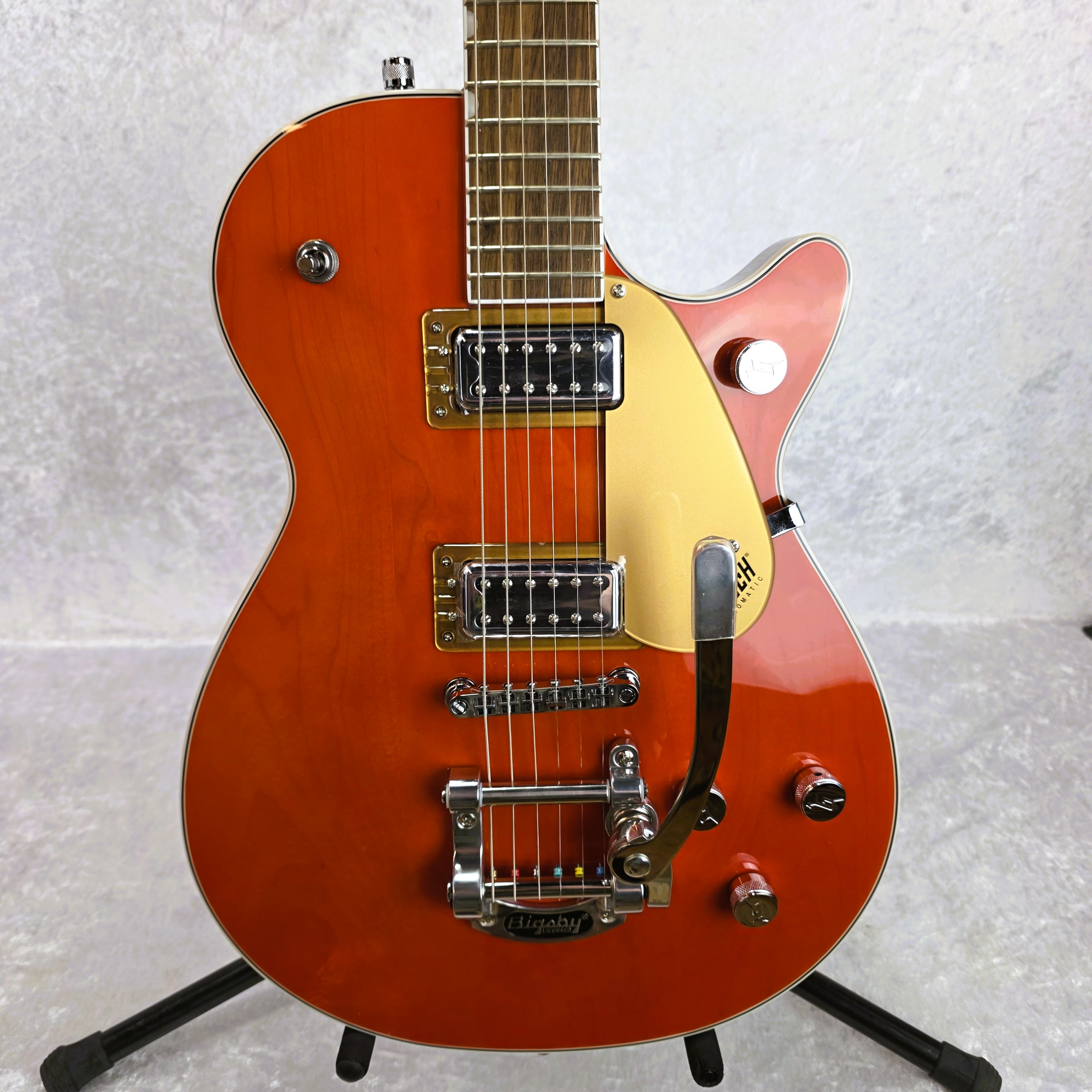 Pure Jet™ Power In its 65-year existence the Gretsch® Jet has been the hallmark sound for iconic players. The all-new G5230T Electromatic® Jet™ FT Single-Cut with Bigsby® captures that essential Jet power and fidelity at an incredible price. Chambered Mahogany Bodies — Loud and Clear Classic Jet tone begins with a chambered mahogany body with maple top that produces full lows and mids with an exceptionally smooth and present high end. The result is a deep acoustic foundation that is robust, yet balanced. Black Top Filter’Tron™ Pickups – Quintessential Power and Clarity Black Top Filter’Tron™ pickups amplify and accentuate the Electromatic Jet FT’s chambered body to produce a wide, balanced and transparent tone. Loud and punchy, this Jet sounds out with remarkable definition at any level of gain. Together, the body and pickups thunder with full, responsive lows and mids with a high end that sparkles without spikes. Total Tonal Control The Electromatic Jet FT is equipped with essential features that give you complete tonal control. The combination of individual pickup volume controls, master tone and master volume with treble bleed circuit provides intuitive global control over your pickup and tone settings.