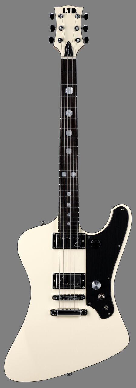 The LTD RZK-III in Olympic White finish features neck-thru-body construction at 25.5” scale, with alder body wings, a three-piece satin-finished maple neck and rosewood fingerboard with 22 extra-jumbo stainless steel frets, glow-in-the dark side markers, TonePros locking bridge and tailpiece (both recessed), a brushed black pickguard, a reversible “kill switch”, LTD locking tuners, and a set of Fishman Fluence Richard Z Kruspe signature pickups with a push-pull control and a mini-toggle switch to select voicings. Includes ESP hardshell form fit case. Neck-Thru 25.5" Alder 3Pc Maple Rosewood 350mm Olympic White Satin 42mm Molded Thin U LTD Block black w/ silver shadow 22 XJ Stainless Steel Chrome Standard LTD Locking TonePros Locking TOM w/ String Thru Fishman RZK Neck *(Pull Volume for Voice 2) Fishman RZK Bridge *(Pull Volume for Voice 2) Active Volume(Push/Pull), 3-way Toggle, Kill Switch, Mini toggle D'Addario XL110-6 (.010/.013/.017/.026/.036/.046) PHOENIX FORM FIT CASE INCLUDED
